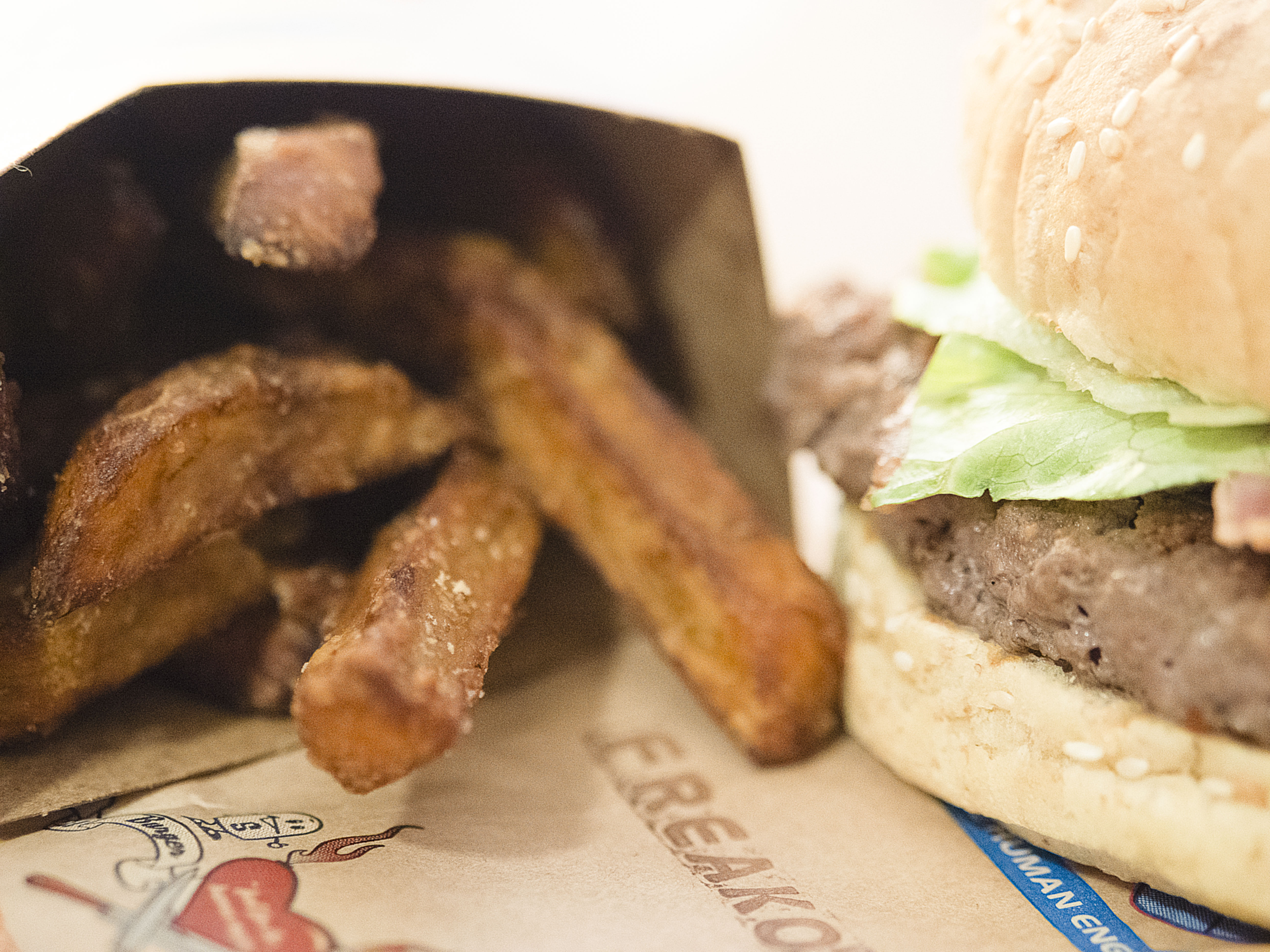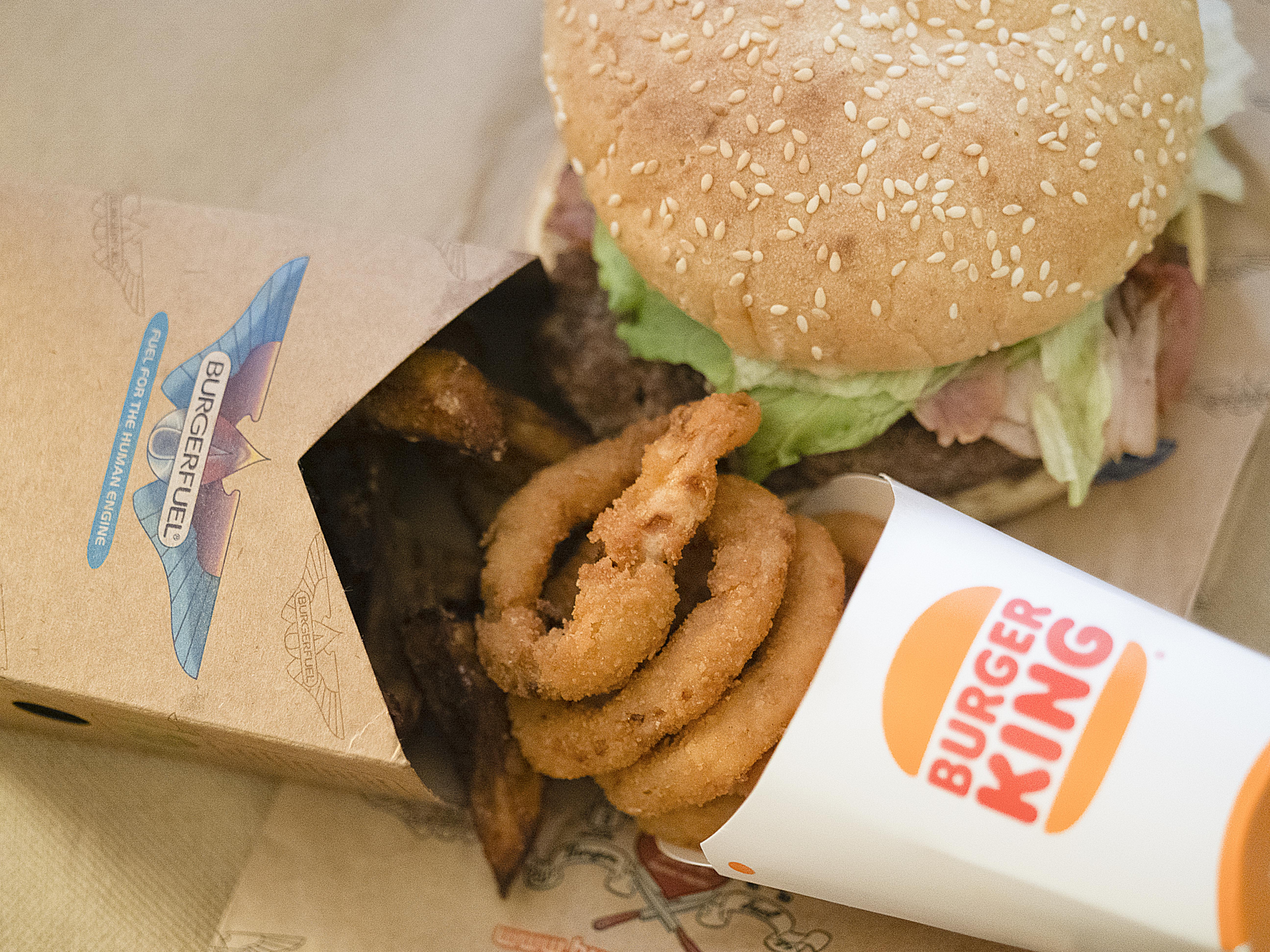 这两天很想吃「炸洋葱圈」。在两家不同的餐馆买了东西,一家叫「Burger King」,一家叫「Burger Fuel」。「Burger King」的炸洋葱圈真好吃。「Burger Fuel」的炸红薯条真好吃。我不说汉堡哪家做得更好吃。